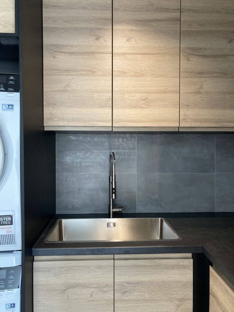 Un large plan de travail permettant de plier le linge a été prévu ainsi qu’un grand évier inox pour profiter du point d’eau existant. Les étagères disposées au-dessus du plan de travail s’intègrent dans la continuité des meubles hauts et habillent le tableau électrique et la baie informatique.