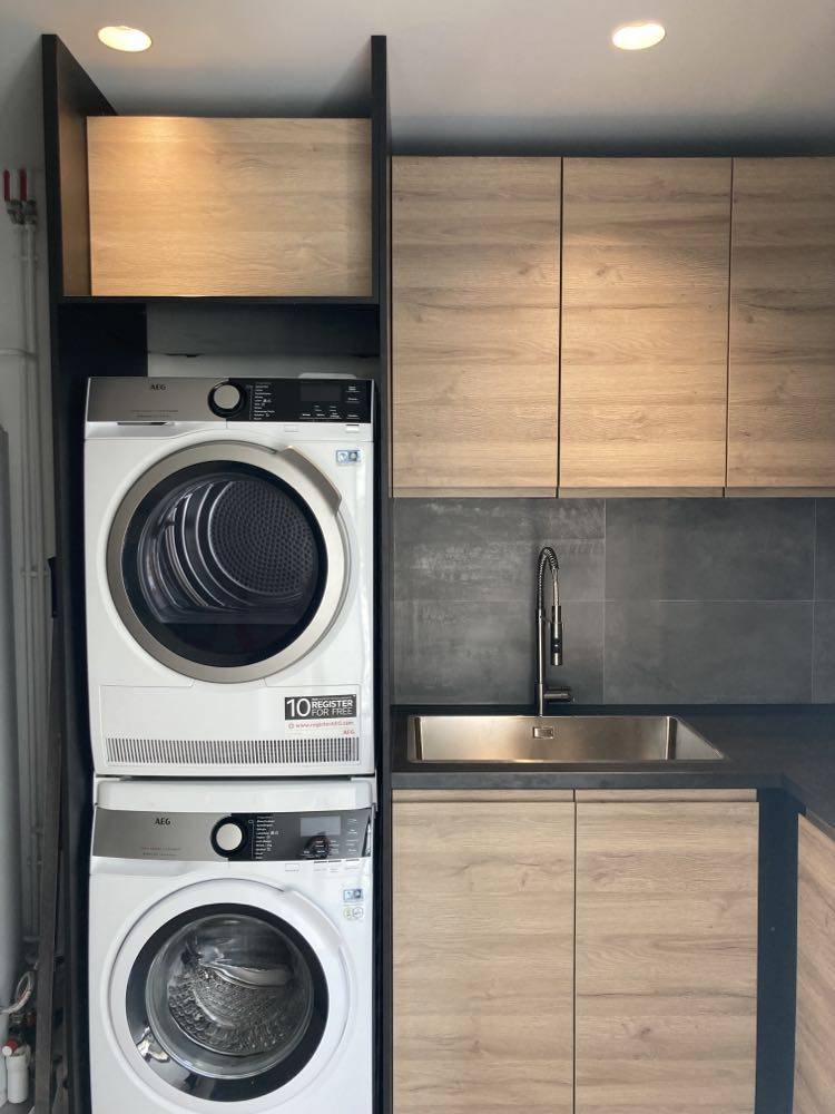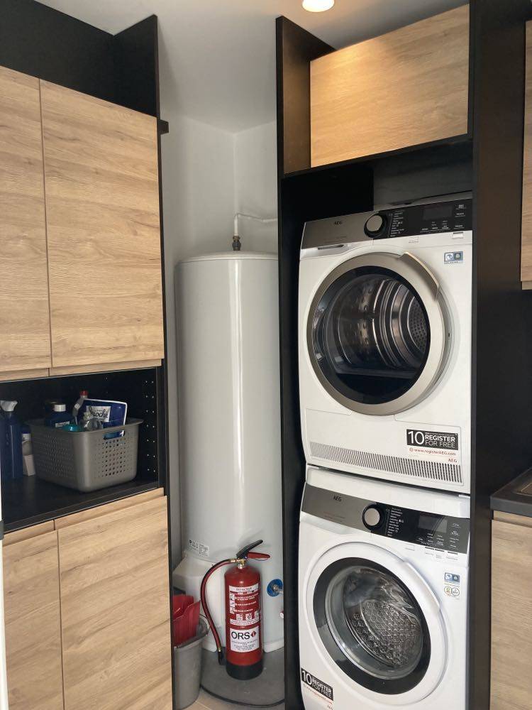 La machine à laver et le sèche-linge sont superposés dans une colonne pour gagner de l’espace et libérer la zone de déplacement.